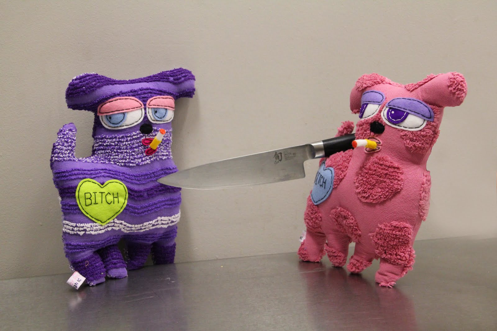 Featured here are Peculiar Pet's "Problem Pets." Despite their carefree demeanor, these gals are eco-friendly! The pets are manufactured from repurposed vintage bedspreads and filled with fiber that is 80% recycled plastic water bottles...
